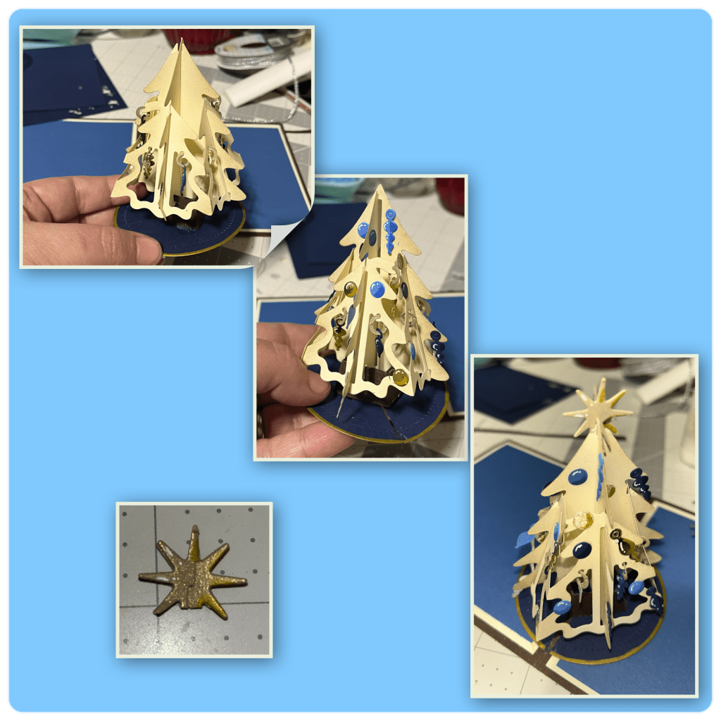 I assembled and decorated the tree, adding the star on the top. and added to the card.