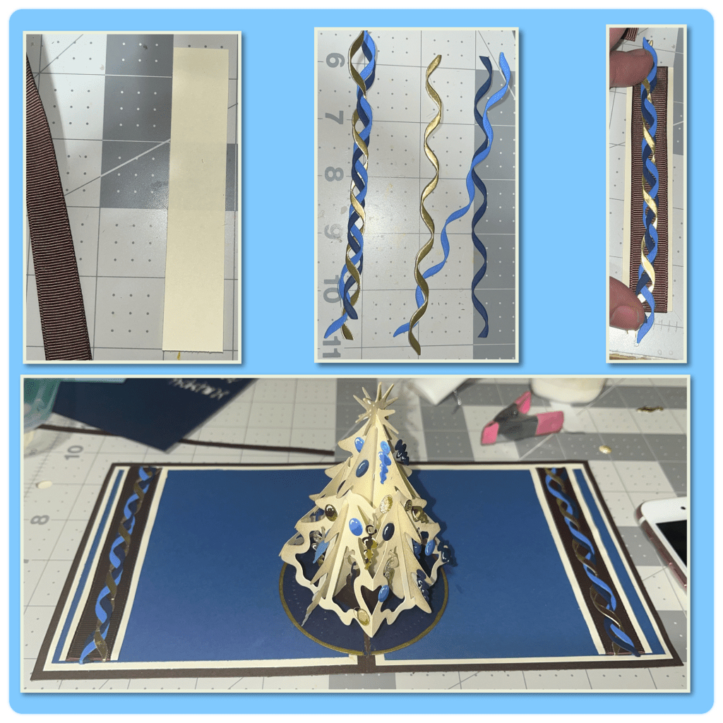 Man I’m a pack rat, I found the same ribbon that I originally used in my stash. To make the border I cut the cardstock slightly bigger than the ribbon and glued the ribbon to the cardstock. Using the Border Blends-Trims I diecut the 2 blues and the gold and twisted them together and added to the ribbon border, then added to the card.