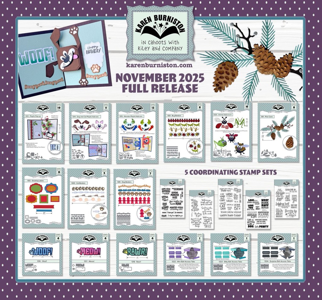 Welcome Crafty Friends, to our Karen Burniston Products – KB Riley LLC November Release Blog Hop. The Design Team have come together with Karen today for a fun blog hop to celebrate the release of 15 new dies and 5 new stamp sets. Sneak peeks of the new release started last week, and the dies are available to order NOW!