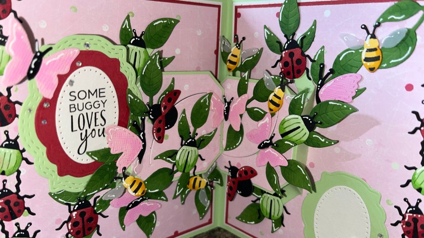 I couldn’t wait to play with the Playful Pop Up set so this is the first card I made. I also used the new Bug Border, and the Greeting Labels set along with the Bug Greetings stamps. Each Playful pop up has 4 moving arms, and I am using 2 so this fun card has 8 moving arms.