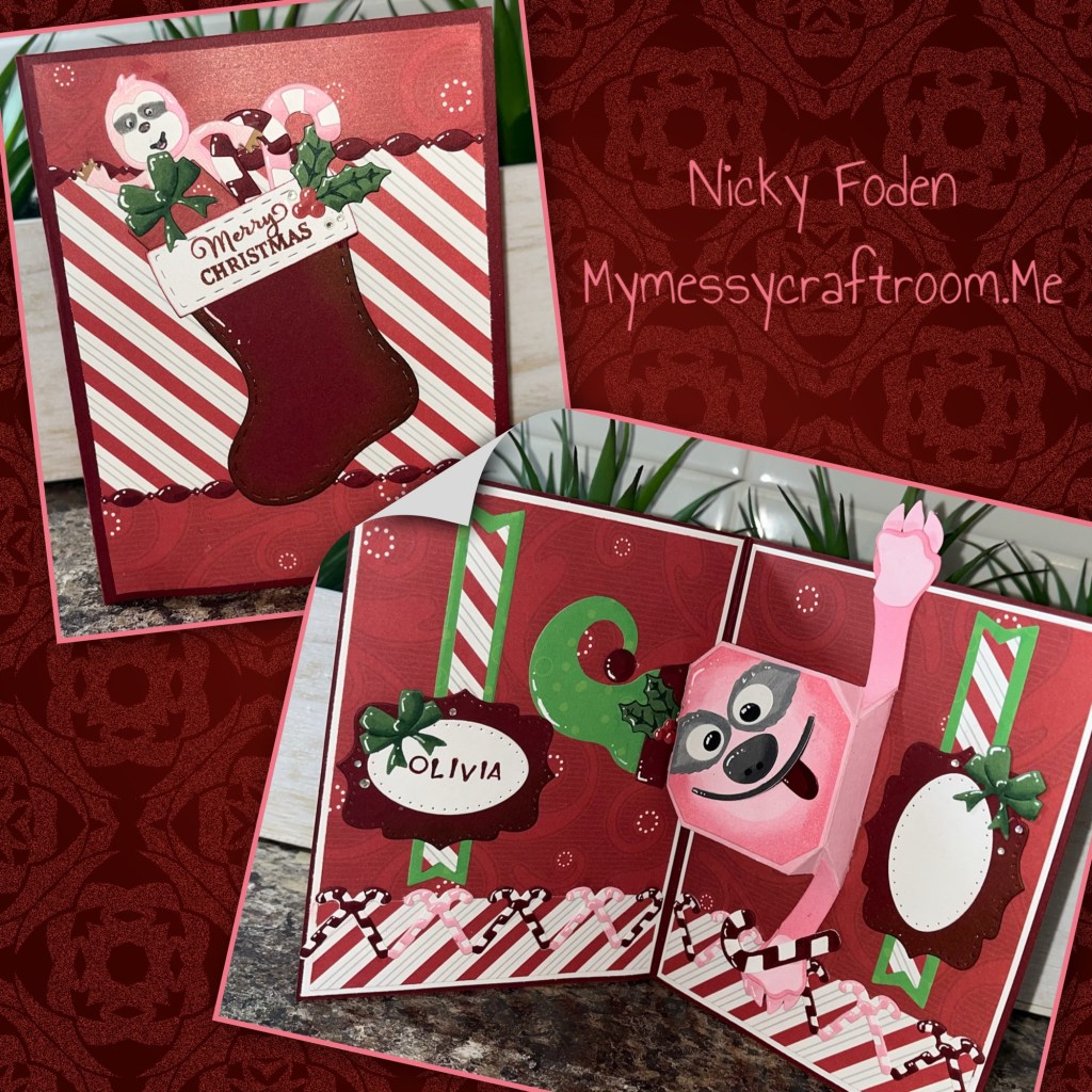 What says Christmas like a big fuzzy pink sloth, lol. I have a sweet little granddaughter that has her most favourite toy in the world and you probably guessed it but it is a pink fuzzy sloth. When I saw her last her I asked what kind of Christmas card would you like and she said a “Baboo Card”, but I want Baboo on the inside. I have made her a few cards with a her little sloth friend hanging out but this is the first one that I have made her that is this big. I think it turned out pretty cute.