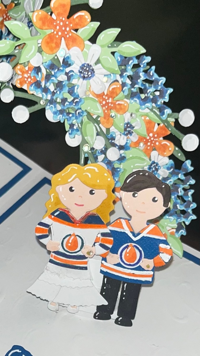 Hello, today I’m sharing a card that was an extra special request. The recipients will be celebrating a milestone anniversary and apparently they are huge Edmonton Oilers fans. So I had the dilemma, how to make a pretty card with a hockey theme. I’m glad she gave me lots of notice, because honestly I was kind of stumped. But in the end this is what I came up with.