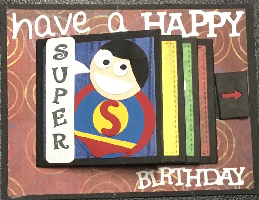 Sooooo I’m cheating a bit this week. I started a post that I’m not done yet, and I really wanted to add a card to this weeks Crazy4Challenges challenge so I had to dig out an older project and pull together a quick post. This weeks challenge was “to go Retro” and we were to interpret “retro” anyway we wanted. What’s more retro than Pac-Man? I remembered that I made a special scrap book for my nephew (it’s a photo/year growth chart scrapbook) and I made a Pac-Man page to add his 9th birthday photo to and I thought it would fit the theme. The size is 6”x6” so this would also make a good card.