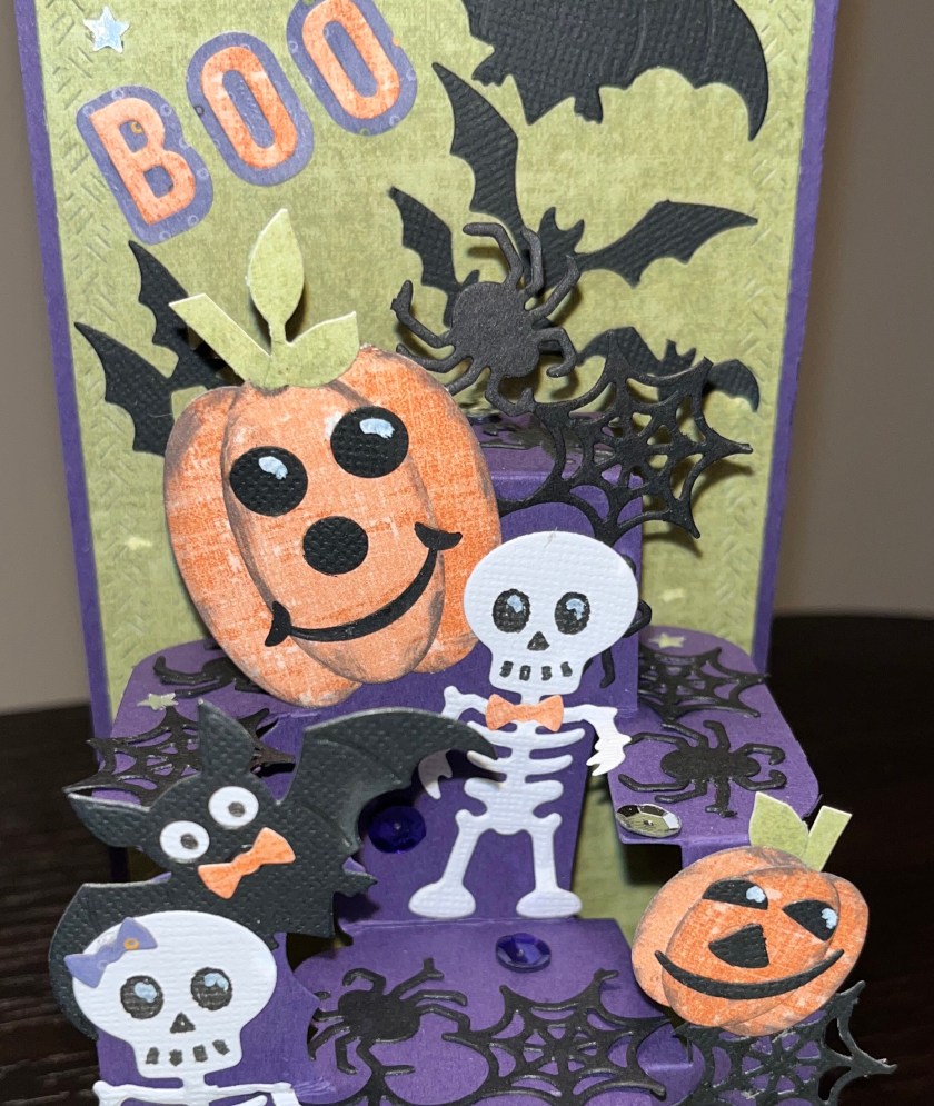 With this technique not only does the haunted mansion pop up but the bats, and the βbooβ swing from left to right, and the ghost swings from right to left. To see this card in action please check out my FACEBOOK page, feel free to join if you would like to share your own crafty creations. You can also see a video of this card on my INSTAGRAM page.