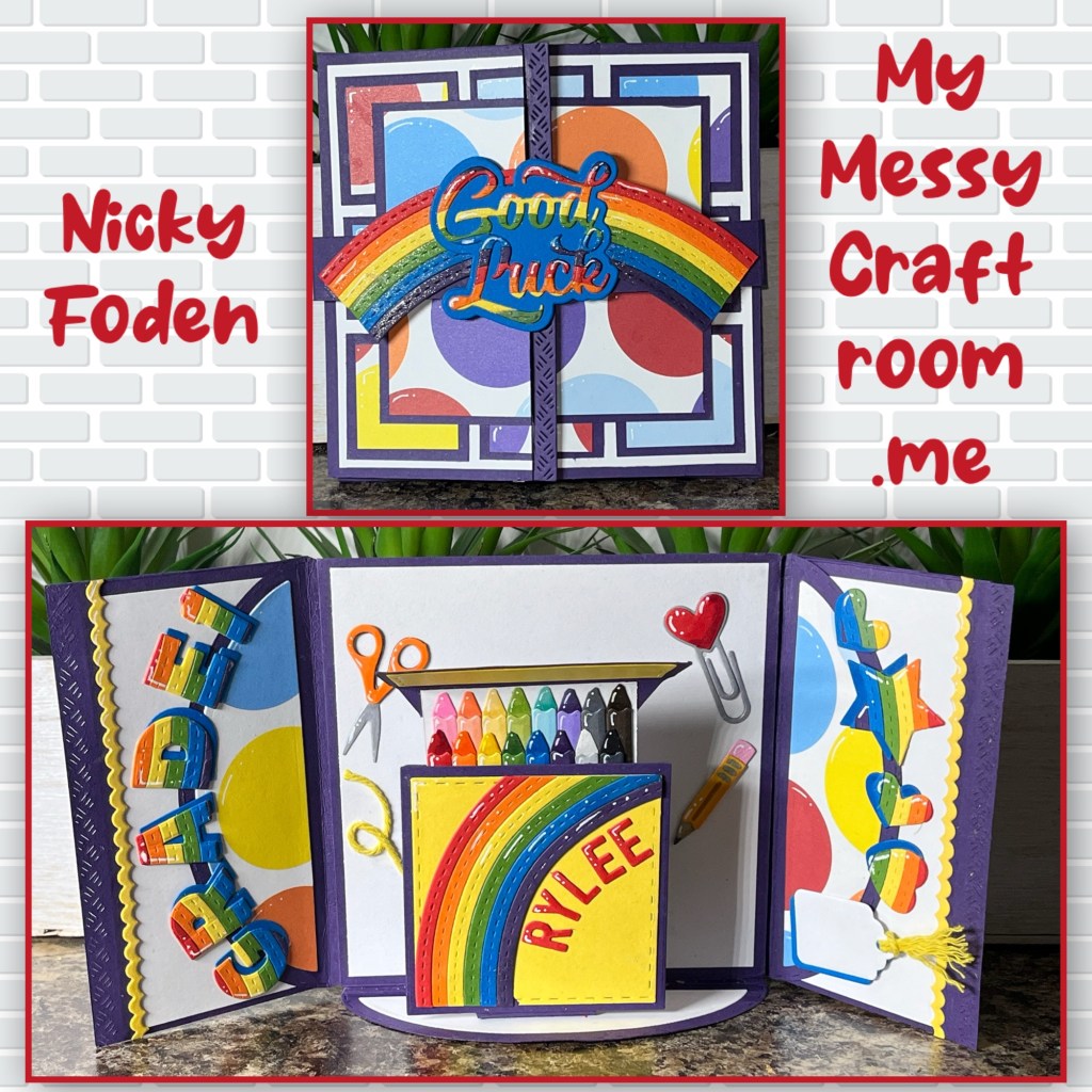 Hello crafty friends, today is design team challenge day and this months challenge was to make a bottom fold card. At first I was a little stumped and then I remembered a card that Karen made a few years ago (Red Christmas card) and thought that this technique would be perfect to make a box of crayons and have the crayons slide out of the box. This is what I came up with…..