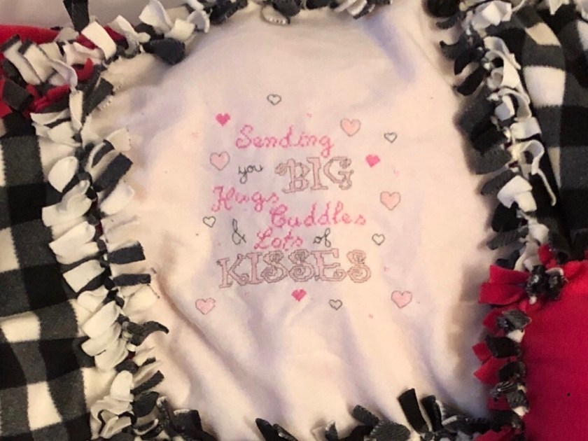 So today I have special blanket and pillow set that I made especially for my very first granddaughter, I have made this type of polar fleece knot blanket before, but this time I wanted it to be extra special so I decided to cross stitch a special message.