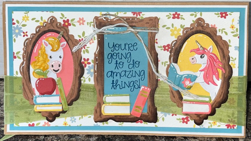 It’s spooky season and time to share my card for the Karen Burniston Design Team Challenge. This month’s challenge is “Peek-A-Boo!” I wanted to make a fun card for one of my Granddaughters so I came up with this cute purple monster. I also have a mini monster peeking over the band on the front of the card. I knew I need to make 3 cards, for 3 sisters so I decided to make a series of Halloween cards using the same size card base, and the same colours and patterned paper. This card is the first of the series. I am also using some of Karens new stamps on this card.