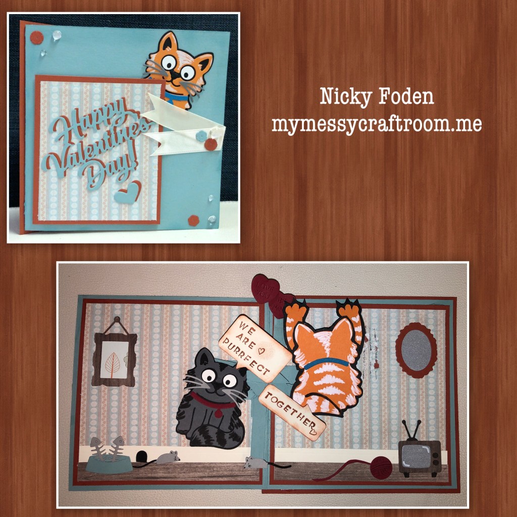 This is how my card meets the parameters. I’ve used the Triple Flip dieset on the front and the Twist Flower dieset (a twist can be a flip right?) on the inside, and well this card has several folds within the mechanism. Main Street colours would be the grey sidewalk, the red bricks, and the other colours would be in the murals that we have in and around our Main Street. Walks would be the cat, cats walk. And I have hearts sprinkled through out and the teacup on the inside has a large heart.